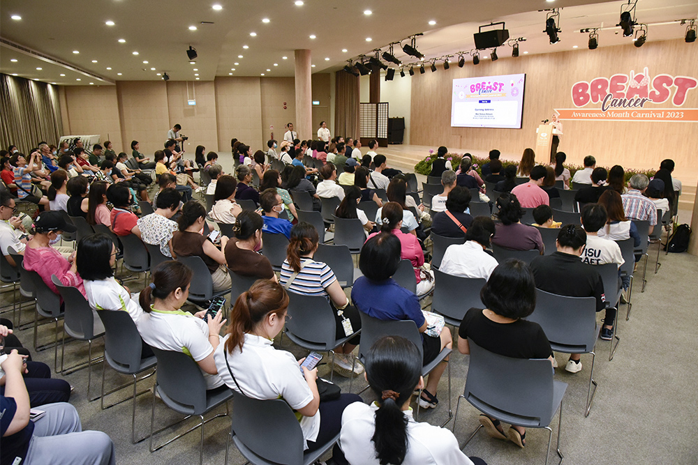 At the Breast Cancer Awareness Month Carnival, Ho Fui Fah talked about her experience of fighting cancer and encouraged everyone to prevent it early by conducting self-examinations and receiving regular breast check-ups.