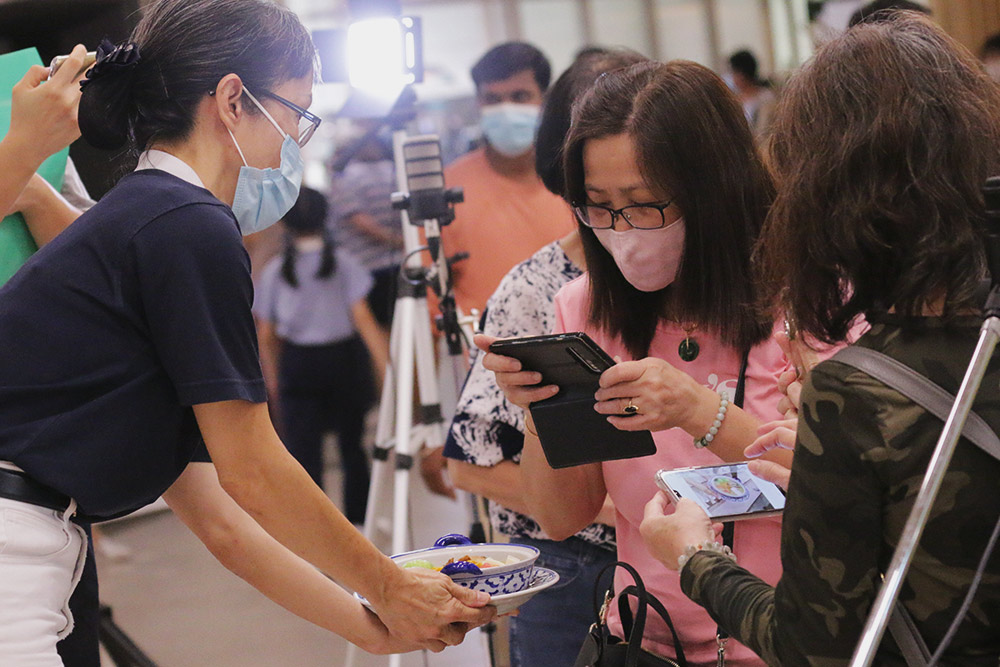 The Jing Si Vegetarian Fish Bee Hoon Soup is so visually appealing that it makes the audience excited to try the dish. Some are seen taking photos of the dish.