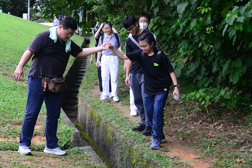 Tzu Shaos are seen crossing the ditch with the assistance of a group leader. Through these outdoor activities, they learn to observe and adapt to the nature park's changing environment. (Photo by Phang Wei Wan)