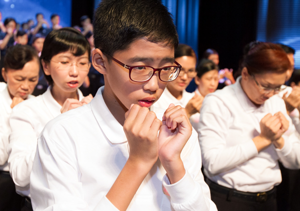 The Chen family transformed their gratitude into action and participated in the Water Repentance Sutra adaptation presented during the 2012 Year-end Blessing Ceremony.(Photo by Alvin Tan)