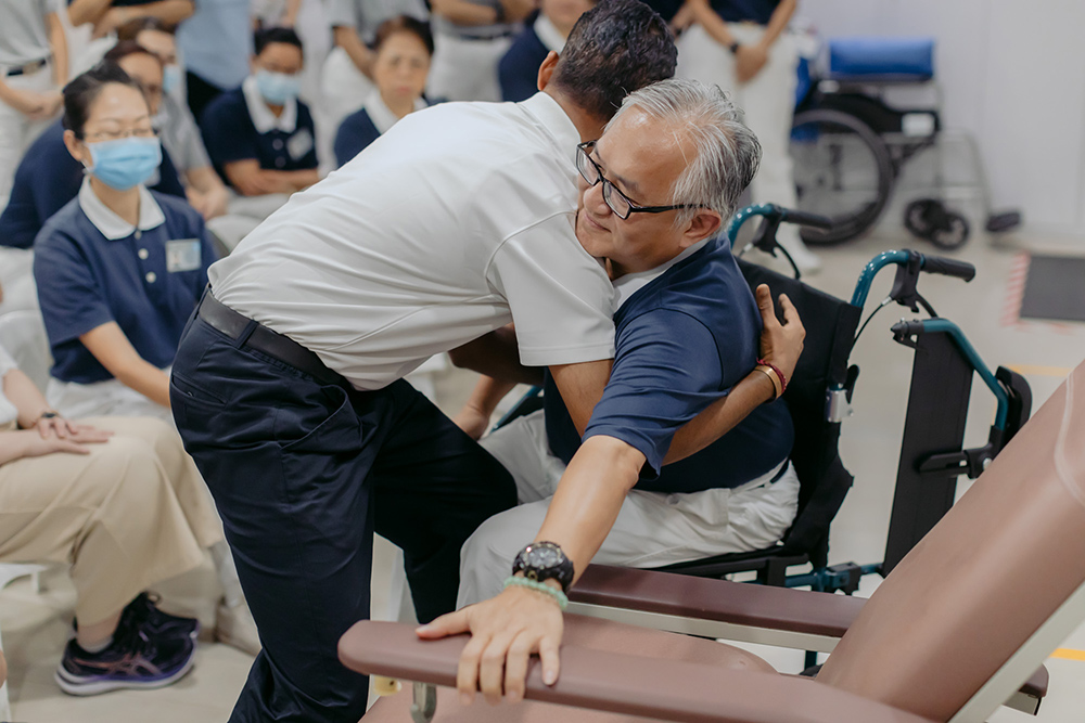 在第四堂培训课上,慈济日间康复中心的首席物理治疗师维诺(Jothiramalingam Vinoth)示范在牙科诊所遇到行动不方便,如患有中风或帕金森氏症的病患时,如何运用正确姿势,协助他们由轮椅转移到牙科椅上。
